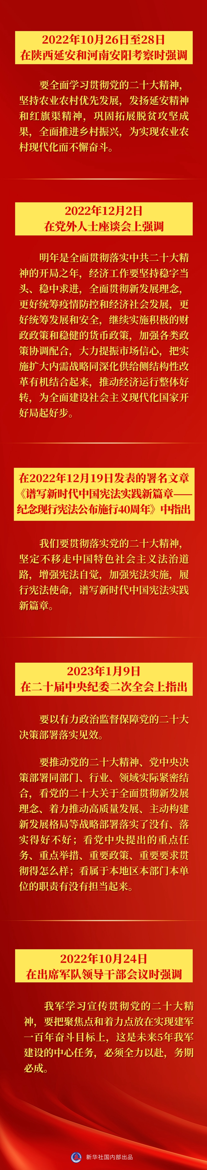 一分部署,九分落實。黨的二十大以來,針對各項具體工作,習(xí)近平總書記在多個場合就學(xué)習(xí)貫徹黨的二十大精神提出要求——