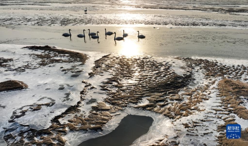 2月3日,一群天鵝在黃河濕地嬉戲。
