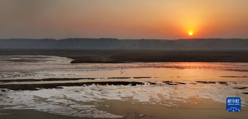 2月3日,黃河西岸的合陽黃河濕地自然保護區(qū)內(nèi),太陽緩緩升起(無人機照片)。