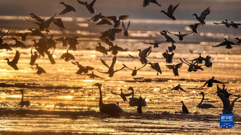 2月3日,黃河西岸的合陽黃河濕地自然保護區(qū)內(nèi),群鳥翔集嬉戲。