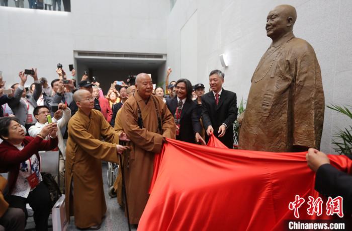 資料圖為2015年10月12日,中華文化研究院大樓(星云樓)在南京大學(xué)啟用,星云大師為自己的雕像揭幕。 圖/中新社記者 泱波