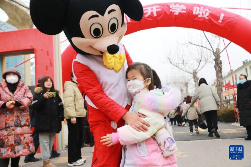 2月7日,山東省高密市金蘋果幼兒園的孩子在入校時與卡通人偶擁抱。