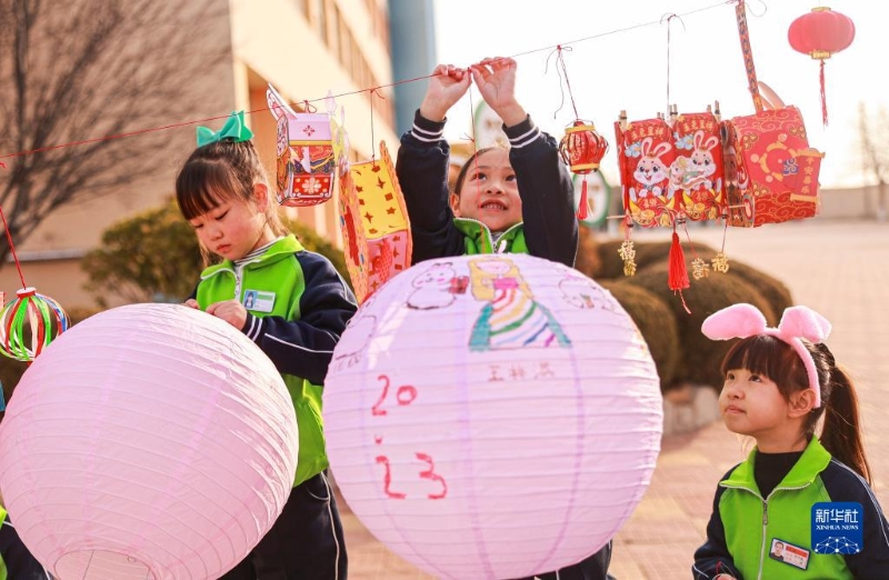 2月7日,山東省榮成市蜊江小學(xué)的學(xué)生懸掛燈籠迎接新學(xué)期。