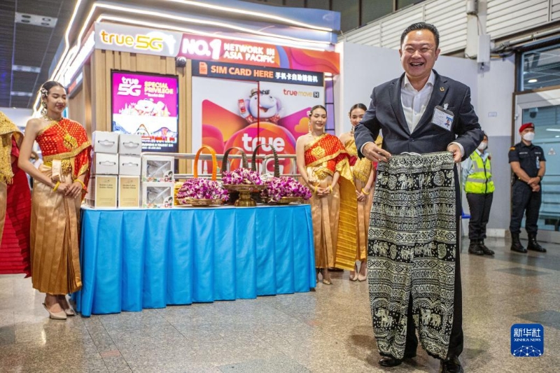 2月6日,在泰國曼谷廊曼國際機(jī)場(chǎng),泰國國家旅游局局長(zhǎng)育他沙展示送給中國游客的禮品。