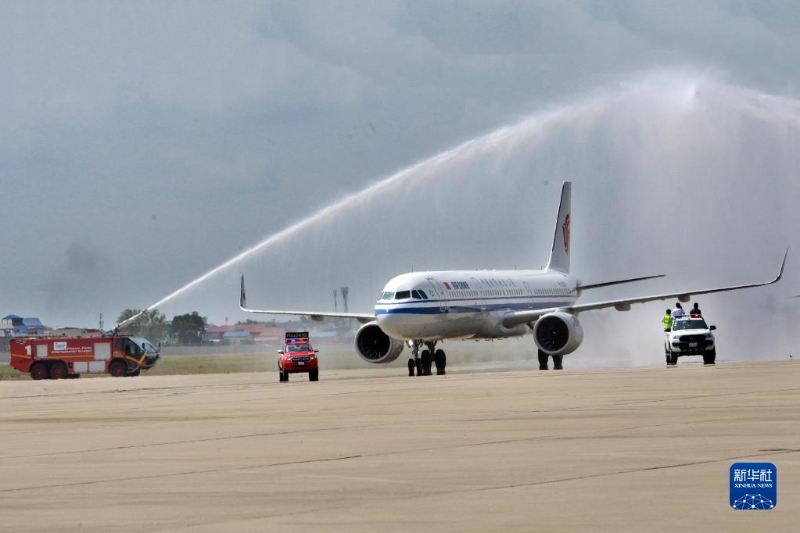2月7日,國航航班在柬埔寨首都金邊國際機(jī)場接受水門禮。