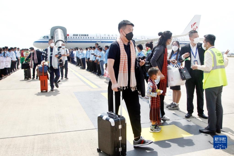 2月7日,一架載有中國乘客的國航航班從北京出發(fā)抵達(dá)柬埔寨首都金邊國際機(jī)場,受到柬埔寨熱烈歡迎。新華社發(fā)(批隆攝)