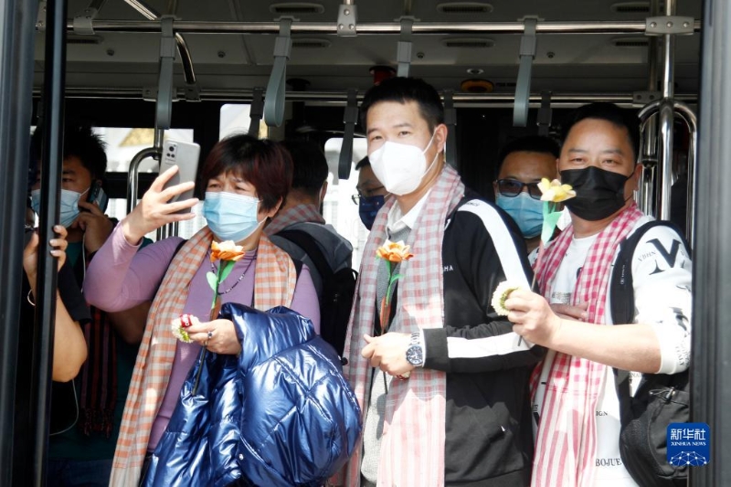 2月7日,中國旅客在柬埔寨首都金邊國際機(jī)場受到柬方歡迎。