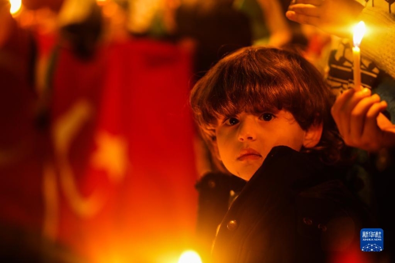 2月7日,在加沙地帶汗尤尼斯,一名兒童手拿蠟燭悼念地震遇難者。