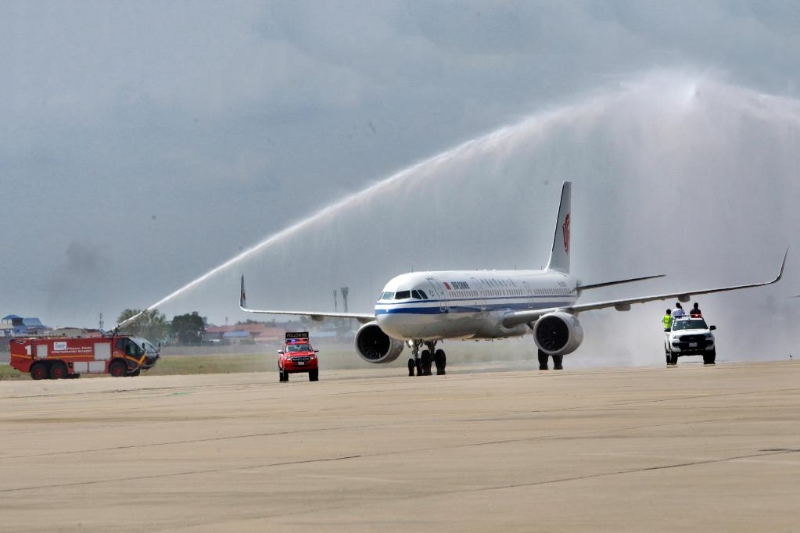 2月7日,國航航班在柬埔寨首都金邊國際機(jī)場接受水門禮。新華社發(fā)(批隆攝)