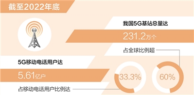 5G用戶占比達(dá)三成,發(fā)展領(lǐng)先全球水平。截至2022年底,我國移動電話用戶規(guī)模為16.83億戶,人口普及率升至每百人119.2部,高于全球平均的每百人106.2部。其中,5G移動電話用戶達(dá)5.61億戶,占移動電話用戶的比例比上年末提高11.7個百分點(diǎn),達(dá)到33.3%,是全球平均水平(12.1%)的2.75倍。