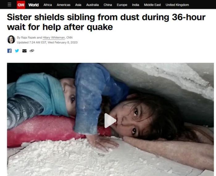 敘利亞西北部伊德利卜省一個村落遭遇強(qiáng)震后,一對年幼姐弟在廢墟中受困超過36小時后終于獲救。搜救人員發(fā)現(xiàn)被夾在巨大水泥板中間的姐弟時,姐姐正舉起小小的手臂,保護(hù)著弟弟頭部?! ?/p>