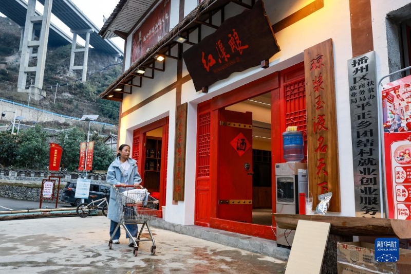 村民在團(tuán)結(jié)村供銷社前搬運貨物(2月2日攝)。仁遵高速通車后,大量游客來到團(tuán)結(jié)村觀光旅游。