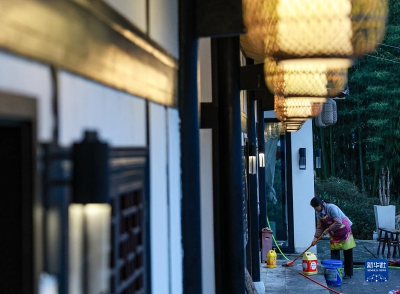 團(tuán)結(jié)村村民在打掃民宿的衛(wèi)生(2月2日攝)。仁遵高速通車后,大量游客來到團(tuán)結(jié)村觀光旅游。