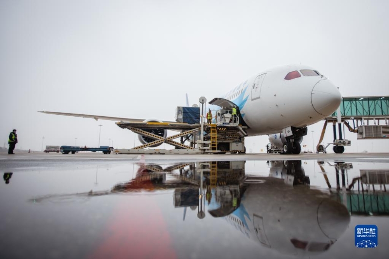 2月8日,機場工作人員將救援物資運入飛機貨倉。