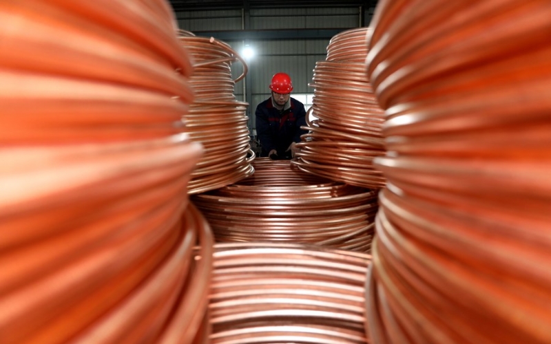 1月29日,江蘇省淮安市洪澤區(qū)華勝工貿(mào)有限公司生產(chǎn)車間內(nèi),工人將銅桿捆綁裝車。新華社發(fā)(殷潮 攝)