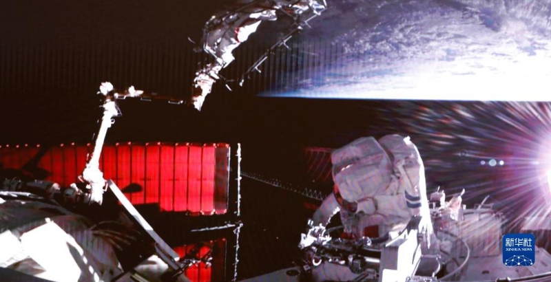 2月9日在北京航天飛行控制中心拍攝的神舟十五號航天員張陸成功出艙的畫面。新華社記者 劉芳 攝