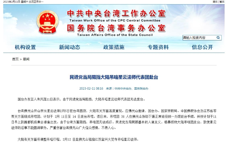 朱鳳蓮表示,臺灣佛光山開山宗長星云法師2月5日在臺灣圓寂,大陸有關方面高度重視。應佛光山邀請,國臺辦、國家宗教局、中國佛教協(xié)會及江蘇省等有關方面組成吊唁團,計劃于2月11日至14日赴臺吊唁。連日來,吊唁團38人在佛光山協(xié)助下循正常途徑統(tǒng)一辦理赴臺手續(xù),并按計劃于11日早上到首都機場集合準備出發(fā)。由于臺灣方面阻擋,吊唁團無法成行。民進黨當局罔顧基本的人道主義,粗暴拒絕大陸吊唁團赴臺,致使星云法師的后事不能圓滿舉辦,嚴重傷害臺灣佛光山廣大信眾感情,不得人心。
