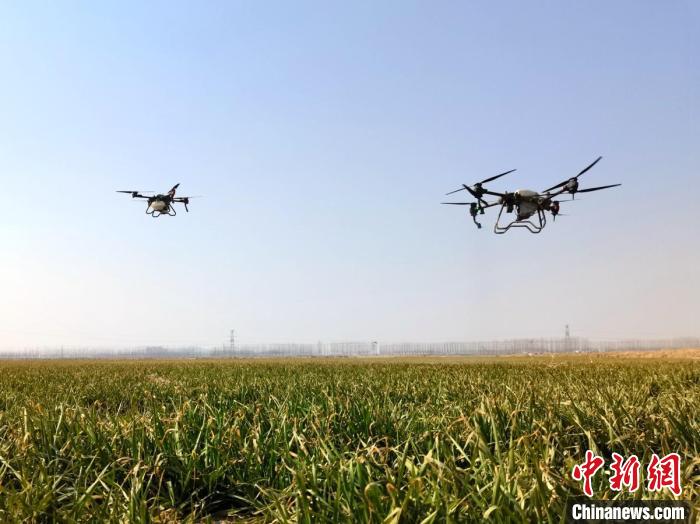 在山東省嘉祥縣紙坊鎮(zhèn)黃村的高標(biāo)準(zhǔn)農(nóng)田里,無人機(jī)和植保機(jī)在田間穿梭。趙九龍 攝