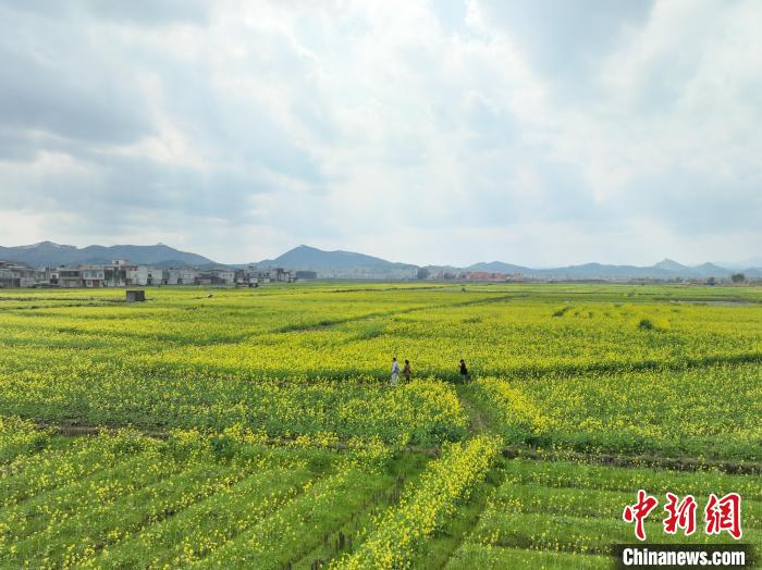 游客在油菜花海中賞花、拍照。陳冠言 攝
