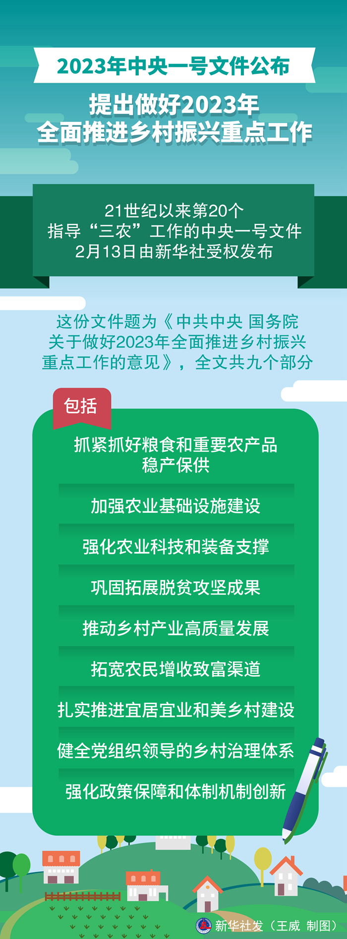 這份文件題為《中共中央 國務(wù)院關(guān)于做好2023年全面推進(jìn)鄉(xiāng)村振興重點工作的意見》,全文共九個部分,包括:抓緊抓好糧食和重要農(nóng)產(chǎn)品穩(wěn)產(chǎn)保供、加強(qiáng)農(nóng)業(yè)基礎(chǔ)設(shè)施建設(shè)、強(qiáng)化農(nóng)業(yè)科技和裝備支撐、鞏固拓展脫貧攻堅成果、推動鄉(xiāng)村產(chǎn)業(yè)高質(zhì)量發(fā)展、拓寬農(nóng)民增收致富渠道、扎實推進(jìn)宜居宜業(yè)和美鄉(xiāng)村建設(shè)、健全黨組織領(lǐng)導(dǎo)的鄉(xiāng)村治理體系、強(qiáng)化政策保障和體制機(jī)制創(chuàng)新。