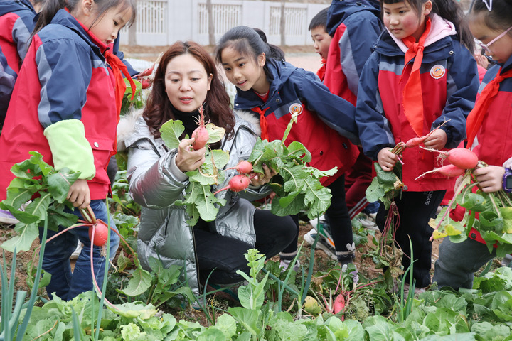 2月13日,四川省綿陽市楊家鎮(zhèn)小學二年級“開學第一課”以體驗勞動和感受收獲為主題,校長吉彥霖帶領二年級學生在學校的菜園體驗勞動。(陳冬冬攝)