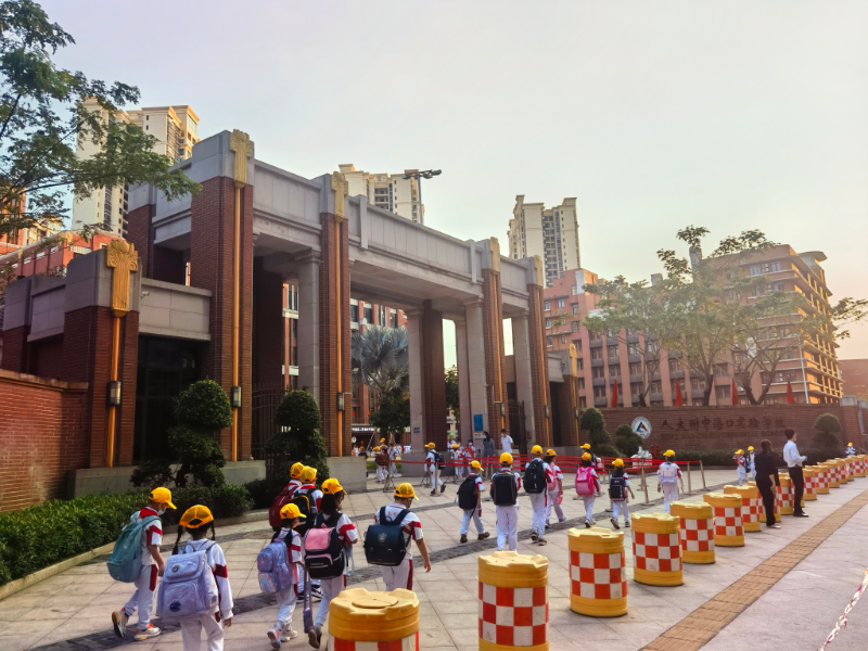 人大附中海口實驗學校的小學生迎著朝陽走進校園。(新華社記者趙葉蘋攝)