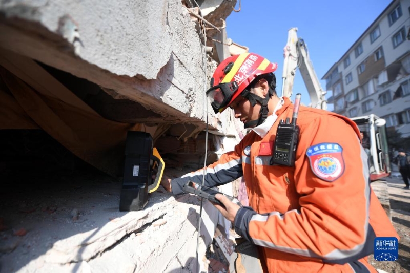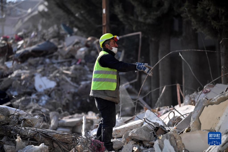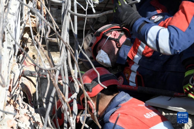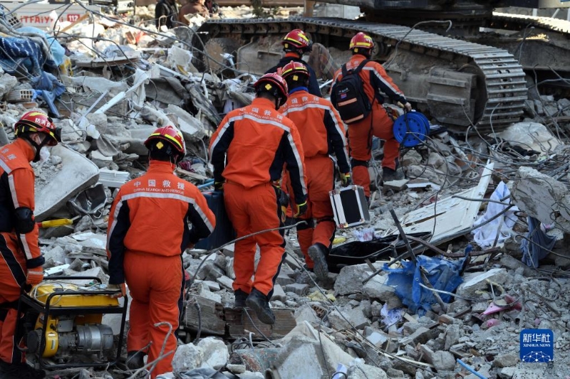 2月12日,中國救援隊(duì)隊(duì)員在土耳其哈塔伊省安塔基亞市一處地震廢墟開展救援工作。