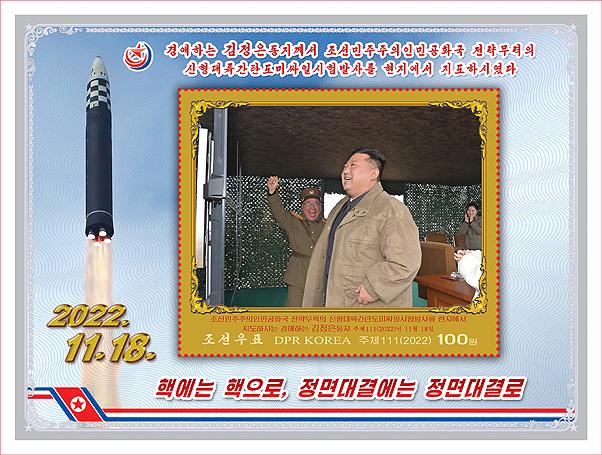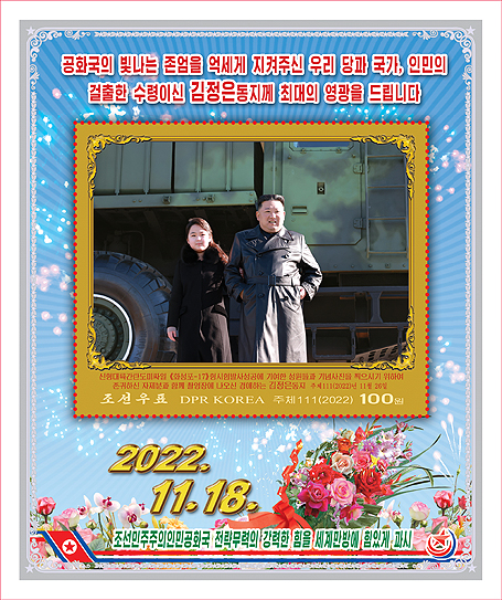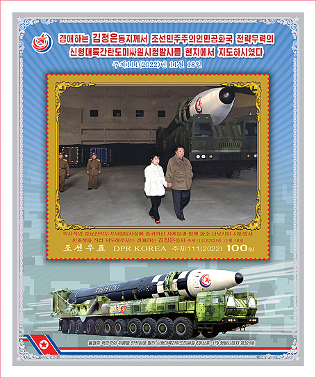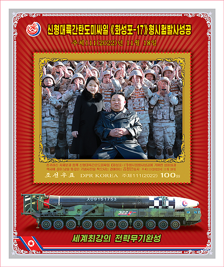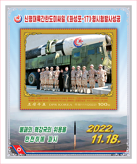 據(jù)朝鮮郵票社介紹,這組郵票主要是與“火星炮—17”型新型洲際彈道導(dǎo)彈試射成功有關(guān),共有8種類型。