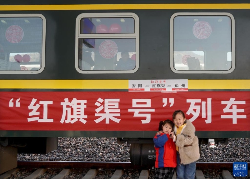 1月20日,在河南林州的鐵路紅旗渠站,兩名小朋友在“紅旗渠號(hào)”列車旁留影。新華社記者 李安 攝
