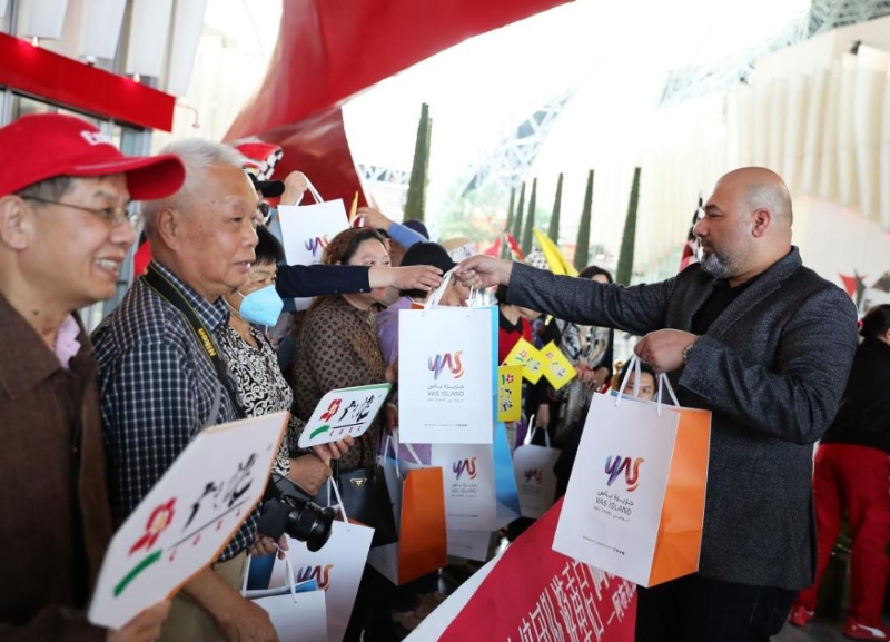 2月7日,在阿聯(lián)酋首都阿布扎比的法拉利世界主題公園,工作人員向中國游客贈送紀念品。新華社記者 王東震 攝