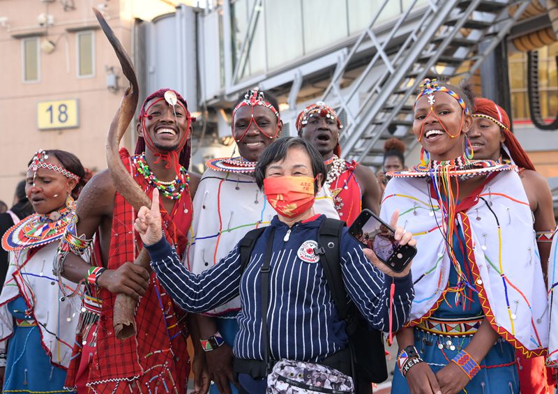 2月11日,在肯尼亞首都內羅畢喬莫·肯雅塔國際機場,中國游客和肯尼亞演員合影。新華社記者 韓旭 攝