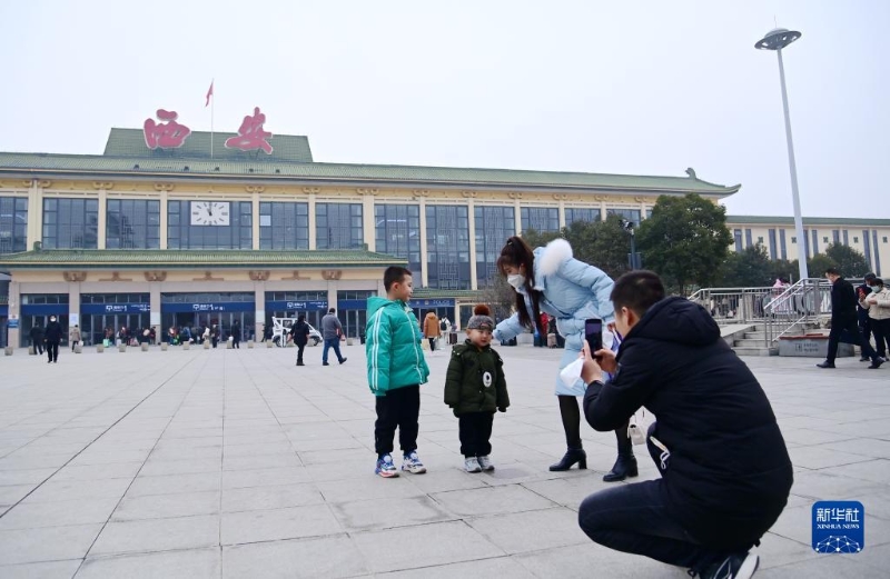 2月15日,旅客在西安站站前廣場(chǎng)拍照留念。