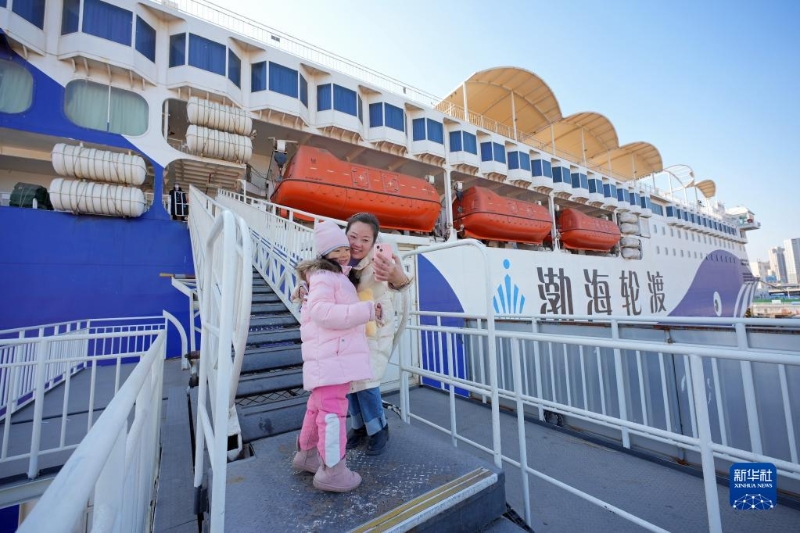 2月15日,在山東港口煙臺(tái)港,一對(duì)母女在登船舷梯上合影。