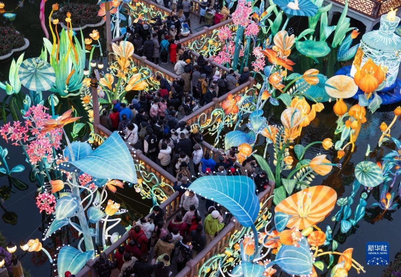 2月15日,市民和游客在上海豫園九曲橋賞燈。