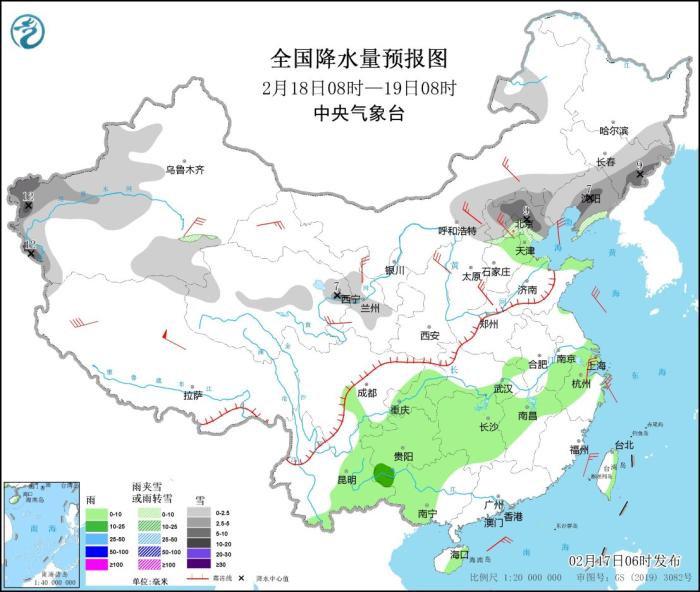 2月18日08時至19日08時,新疆西部山區(qū)、內(nèi)蒙古中部偏南地區(qū)、黑龍江東南部部、吉林東部、遼寧大部、甘肅中南部、華北北部等地的部分地區(qū)有小到中雪或雨夾雪,其中,遼寧中南部、吉林東部、河北東北部、北京北部山區(qū)等地局地有大雪,新疆西部山區(qū)的部分地區(qū)大雪,局地暴雪(10~12毫米);華北地區(qū)東南部、西南地區(qū)東部、江南西部和北部、華南西部、云南東部等地的部分地區(qū)有小到中雨。新疆東部、甘肅中西部、內(nèi)蒙古大部、遼東半島、西北地區(qū)東部、華北西部和北部、浙江北部、西藏等地的部分地區(qū)有4~6級風,其中西藏中北部的部分地區(qū)風力可達7級以上。渤海、渤海海峽、黃海大部海域、巴士海峽、南海大部海域?qū)⒂?~8級、陣風9級的大風。