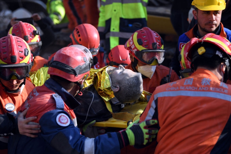 2月12日,在土耳其哈塔伊省安塔基亞市,中國救援隊轉(zhuǎn)移一名救出的幸存者。新華社記者 沙達提 攝