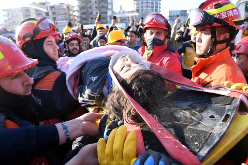 2月9日,在土耳其哈塔伊省安塔基亞市,中國救援隊與土耳其救援隊轉(zhuǎn)移一名救出的女性幸存者。 新華社記者 沙達提 攝