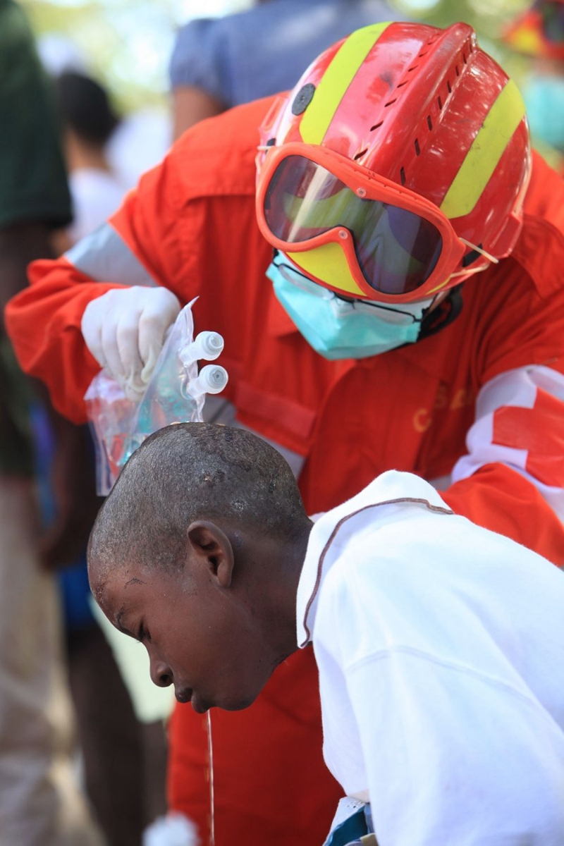 2010年1月14日,中國國際救援隊的醫(yī)務(wù)人員在海地首都太子港為傷員進行治療。 2010年1月13日,海地地區(qū)發(fā)生7級以上強震,人員傷亡慘重,財產(chǎn)損失巨大。海地地震發(fā)生后,中國國際救援隊是第一支趕到災(zāi)區(qū)并同時展開搜救和醫(yī)療救助的國際救援隊。 新華社記者 邢廣利 攝