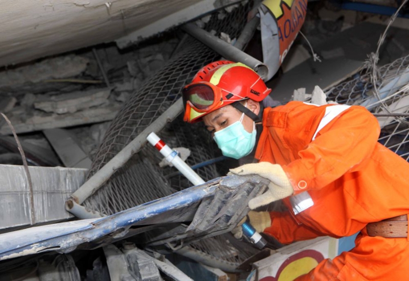 2011年2月28日,中國救援隊隊員在新西蘭克賴斯特徹奇市的坎特伯雷電視大樓廢墟中搜救。2月22日,克賴斯特徹奇發(fā)生6.3級地震,造成180多人死亡。新華社記者 李秋嬋 攝