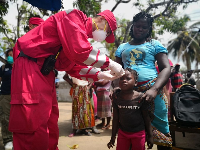 2019年3月27日,在莫桑比克貝拉市區(qū)一處災(zāi)民安置點,中國救援隊醫(yī)護人員為一名兒童測量體溫。赴莫桑比克實施國際救援的中國救援隊27日至28日在受強熱帶氣旋“伊代”重創(chuàng)的莫中部索法拉省展開救助行動。新華社記者 聶祖國 攝