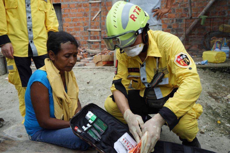 2016年4月21日,在厄瓜多爾曼塔,中國公羊救援隊隊員救助一位災(zāi)民。一場強烈地震4月16日撕裂了厄瓜多爾西北部沿海五省,厄瓜多爾政府宣布國家進入緊急狀態(tài)。新華社發(fā)
