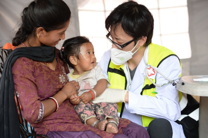 2015年5月1日,在尼泊爾巴德崗杜巴廣場,來自中國明珠救援隊的徐醫(yī)生(右)為小朋友看病。尼泊爾發(fā)生8.1級強震,面對這場突如其來的自然和人道主義災(zāi)難,作為尼泊爾友鄰的中國迅速動員起來,數(shù)十支來自中國國家、軍方和民間的救援隊、醫(yī)療隊第一時間緊急趕赴災(zāi)區(qū)施救。新華社記者 秦晴 攝