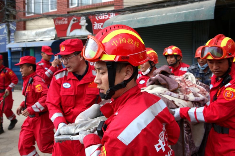 2015年4月26日,在尼泊爾首都加德滿都,搜救隊員從坍塌的樓房中抬出一名幸存者。中國國際救援隊26日到達尼泊爾后,經(jīng)過4小時艱苦搜救,在加德滿都西北部發(fā)現(xiàn)一名幸存的20多歲男青年。新華社記者 白陽 攝