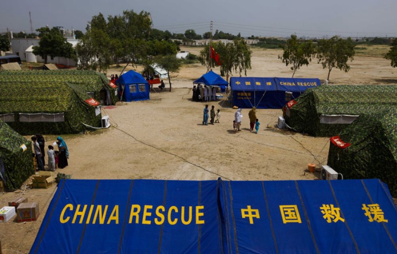 2010年9月15日,在巴基斯坦南部受洪災(zāi)最嚴重的特達地區(qū),當?shù)孛癖娫谥袊鴩H救援隊的流動醫(yī)院尋求中國醫(yī)生的診治。 新華社記者 周磊 攝