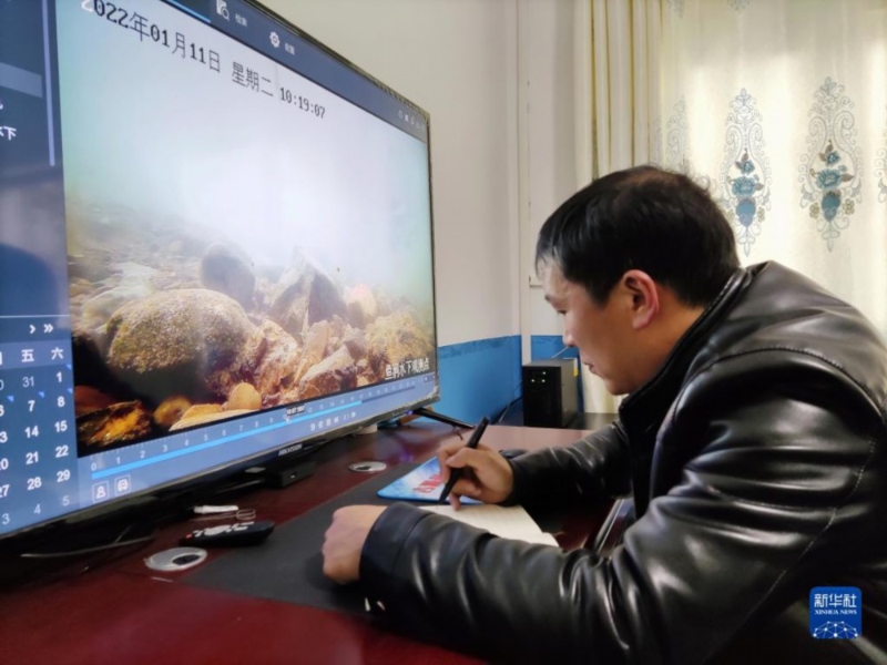 工作人員在云南省昭通市鎮(zhèn)雄縣魚洞生態(tài)觀測(cè)點(diǎn)記錄監(jiān)測(cè)情況(2022年1月11日攝)。新華社記者 林碧鋒 攝