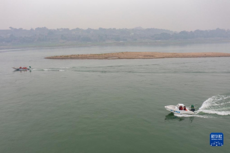 2023年2月7日,鴻鵠護(hù)魚志愿隊(duì)隊(duì)員在長(zhǎng)江重慶江津段巡護(hù)(無(wú)人機(jī)照片)。新華社記者 黃偉 攝