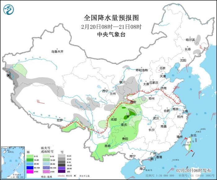2月20日08時至21日08時,新疆南疆南部、西藏西部和東南部、青海南部、甘肅東部、寧夏中南部、陜西北部和南部山區(qū)、川西高原東部、湖北西部、河南西部、重慶北部和東部、黑龍江東南部等地部分地區(qū)有小雪或雨夾雪,其中,新疆南疆西部山區(qū)局地有中到大雪(5~9毫米);西藏東南部、四川盆地、重慶大部、貴州大部、云南南部和東部、臺灣島東部等地部分地區(qū)有小雨,局地中雨。西藏北部、吉林東部、遼東半島、山東半島、浙閩沿海地區(qū)等地部分地區(qū)有4~6級風。渤海、渤海海峽、黃海北部和中部、東海東北部和南部、臺灣海峽及以東洋面、巴士海峽、南海大部等地部分地區(qū)有7~8級風,陣風9~10級。