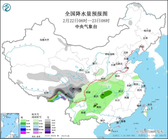 2月22日08時至23日08時,西藏東部、云南西北部、青海南部、川西高原、甘肅東部、陜西東南部、河南西部等地部分地區(qū)有小到中雪或雨夾雪,其中,西藏東部、川西高原、云南西北部等地局地有大到暴雪(10~15毫米)。西南地區(qū)大部、江漢大部、湖南西部和北部等地部分地區(qū)有小到中雨,其中,西藏東南部局地有大到暴雨。臺灣海峽、巴士海峽、南海東部等地部分地區(qū)有6~7級風,陣風8級。