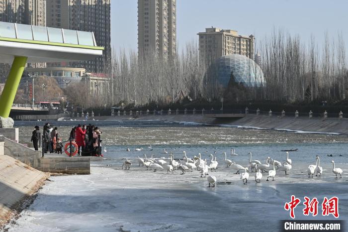 氣溫升高,位于新疆南部的孔雀河,冰雪消融,庫爾勒城市中心,野生天鵝在水中游弋?!〈_.胡熱 攝