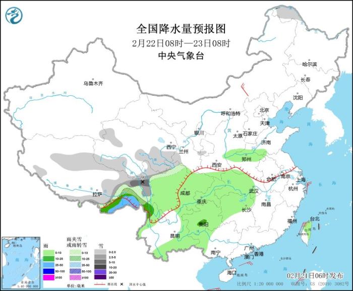 全國降水量預報圖(2月21日08時-22日08時)。圖片來源:中央氣象臺網站